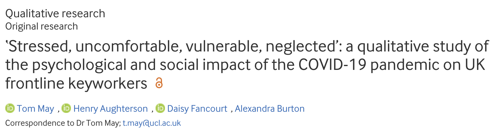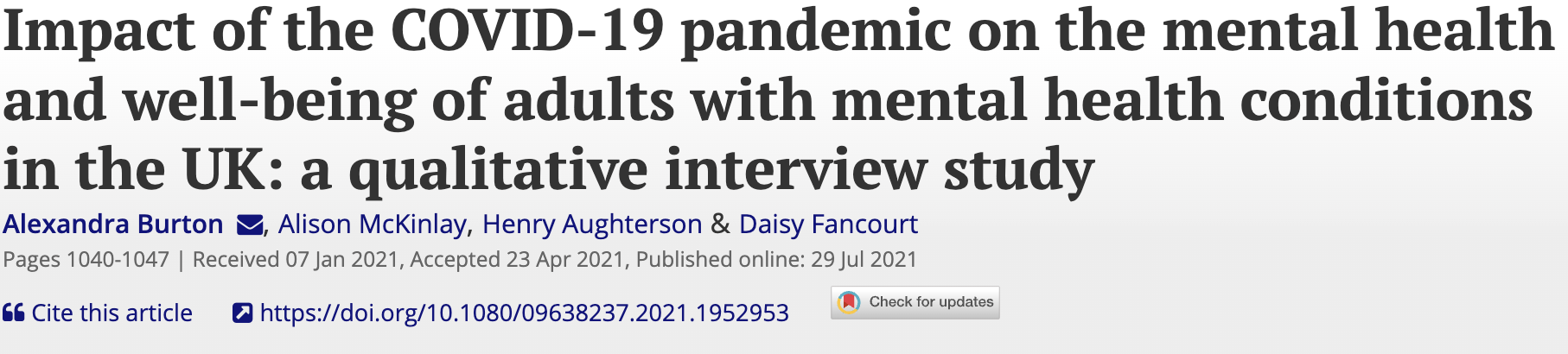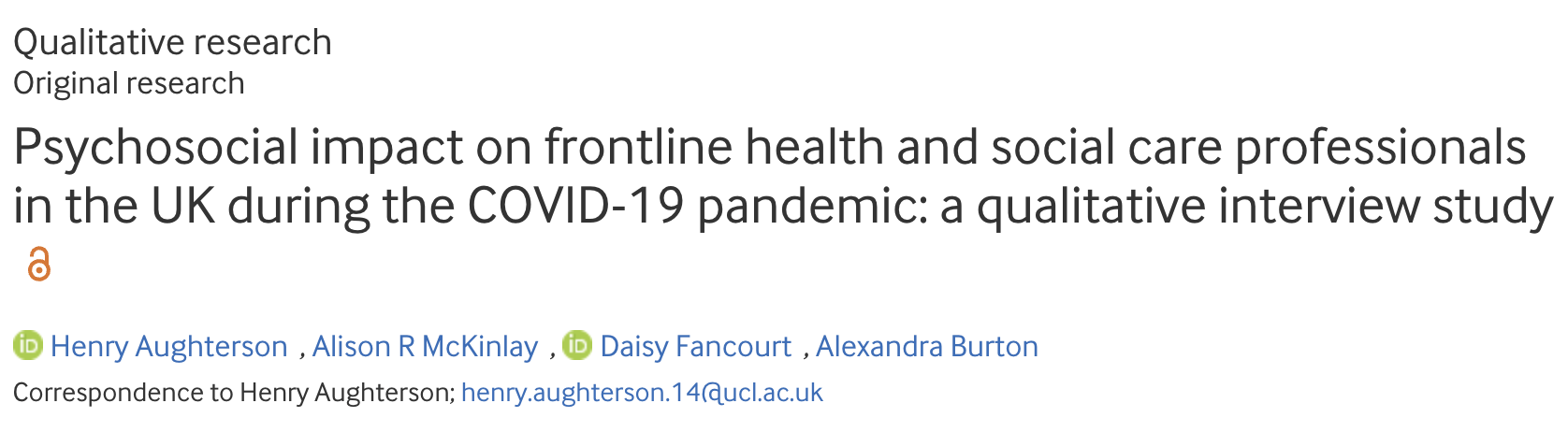 Author of multiple studies throughout the Covid-19 pandemic on the mental health impact of the pandemic on those with: Mental health conditions, Long Covid, Non-Healthcare Key Workers, Healthcare Workers